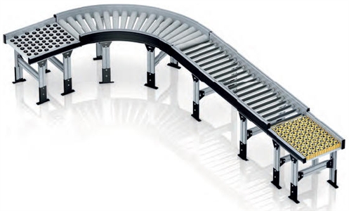 根據(jù)實(shí)際空間位置,滾筒輸送線設(shè)計(jì)了一個(gè)90°的彎道滾筒輸送線結(jié)構(gòu)。而對于彎道滾筒輸送線的動(dòng)力驅(qū)動(dòng),決定應(yīng)用將電機(jī)和減速器共同置于輥筒體內(nèi)部的新型驅(qū)動(dòng)裝置——電動(dòng)滾筒。為了形成滾筒彎道,設(shè)計(jì)時(shí)采用錐形電動(dòng)滾筒。